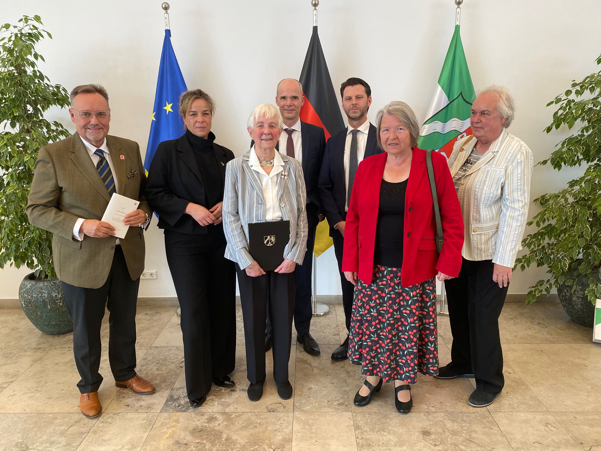 Mona Neubaur, stellvertretende Ministerpräsidentin des Landes Nordrhein-Westfalen, überreichte am Montag, 23.März 2026, in der Düsseldorfer Staatskanzlei den Verdienstorden des Landes an Monika Degenhard. Mit ihr wurden 14 engagierte Bürgerinnen und Bürger aus Nordrhein-Westfalen für ihren herausragenden ehrenamtlichen Einsatz für das Gemeinwohl und die Gesellschaft geehrt. Monika Degenhard erhielt die Auszeichung für ihre langjährige Arbeit als 1.Vorsitzende des Düsseldorfer Vereins für Familienkunde, als Leiterin der Bezirksgruppe Düsseldorf der Westdeutschen Gesellschaft für Familienkunde, als Schriftleiterin der Periodika beider Gesellschaften und für ihre eigenen zahlreichen Publikationen und Beiträge zur Dokumentation der Geschichte der Menschen und des Region. Wir gratulieren besonders herzlich!